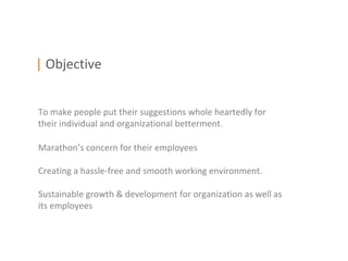 This document outlines an employee engagement program with the objectives of encouraging employees to provide suggestions for individual and organizational improvement, and creating a smooth working environment. It proposes several activities to communicate the program to employees, such as sending daily email countdowns with motivational quotes, putting up posters with quotes about the importance of truth and confidentiality, and placing blank note boards around the office to collect anonymous feedback. The goal is to generate participation and confidence by promoting themes of growth, insight, advantage, team spirit, and transparency.