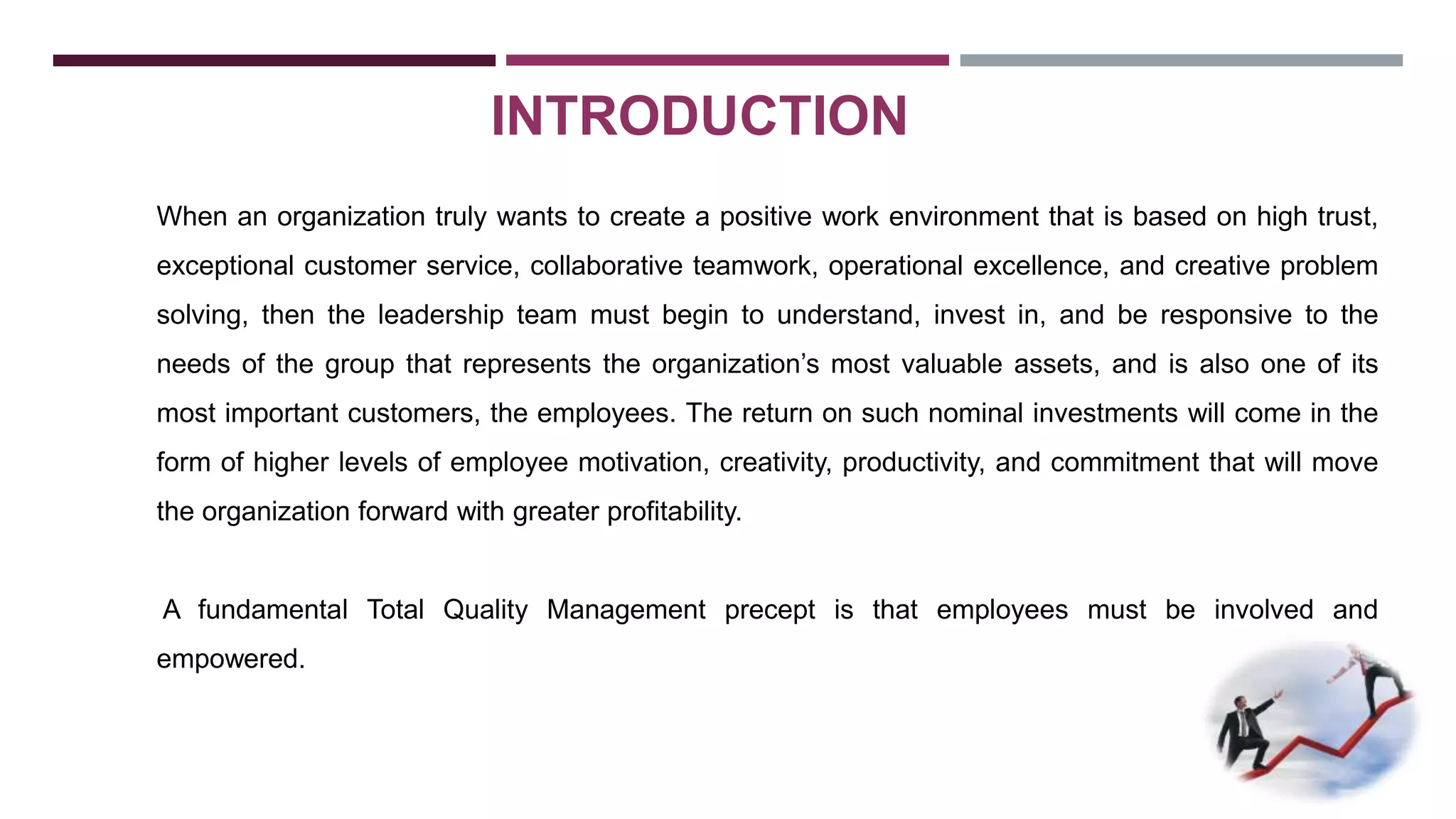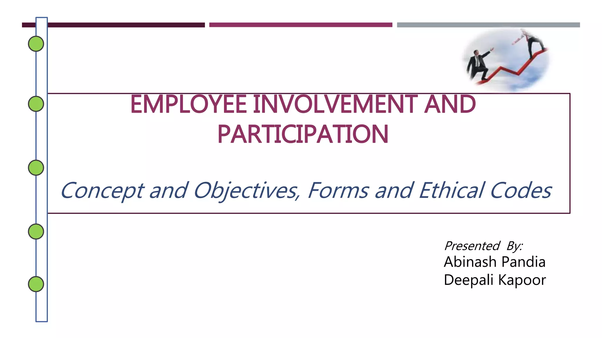This document discusses employee involvement and participation in organizations. It defines employee involvement as creating an environment where employees can impact decisions that affect their jobs. Employee participation means employees are part of teams and can suggest ideas and make decisions about their work. Involving employees can motivate workers and improve productivity, creativity, and commitment. The document outlines several methods for implementing employee participation, such as giving employees responsibility, training, communication, and rewards. It also discusses the objectives and benefits of participative management styles in organizations.