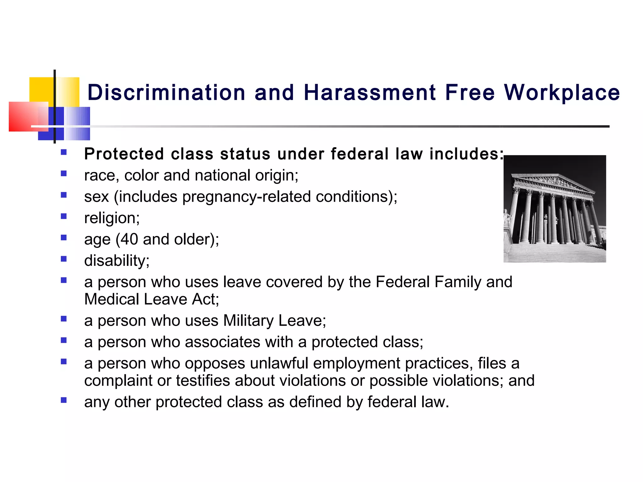 This document outlines a workplace policy on discrimination, harassment and maintaining a respectful work environment. It defines protected classes under federal and state law, and what constitutes discrimination, harassment and sexual harassment. It provides examples of prohibited behaviors and explains the process for reporting complaints. It stresses the importance of preventing and addressing inappropriate conduct to ensure a productive work environment where all employees feel safe and respected.