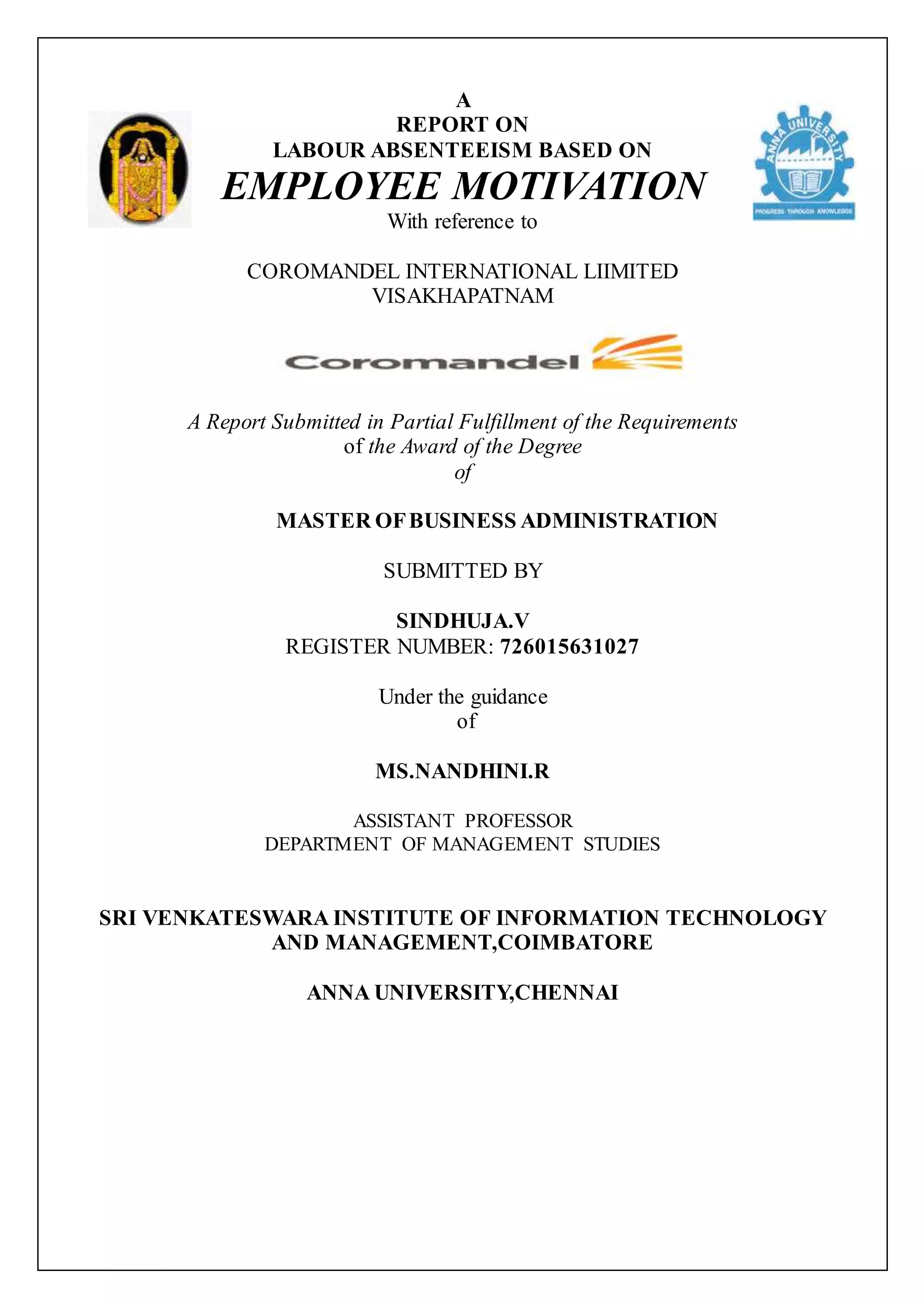 This document is a report submitted by Sindhuja V to fulfill requirements for a Master of Business Administration degree. The report focuses on employee absenteeism at Coromandel International Limited in Visakhapatnam, India. It examines the issue of absenteeism based on employee motivation levels. The report includes an introduction, company profile, literature review, data analysis, findings, and recommendations. The objective is to analyze the impact of motivation on employee absenteeism at Coromandel International Limited.