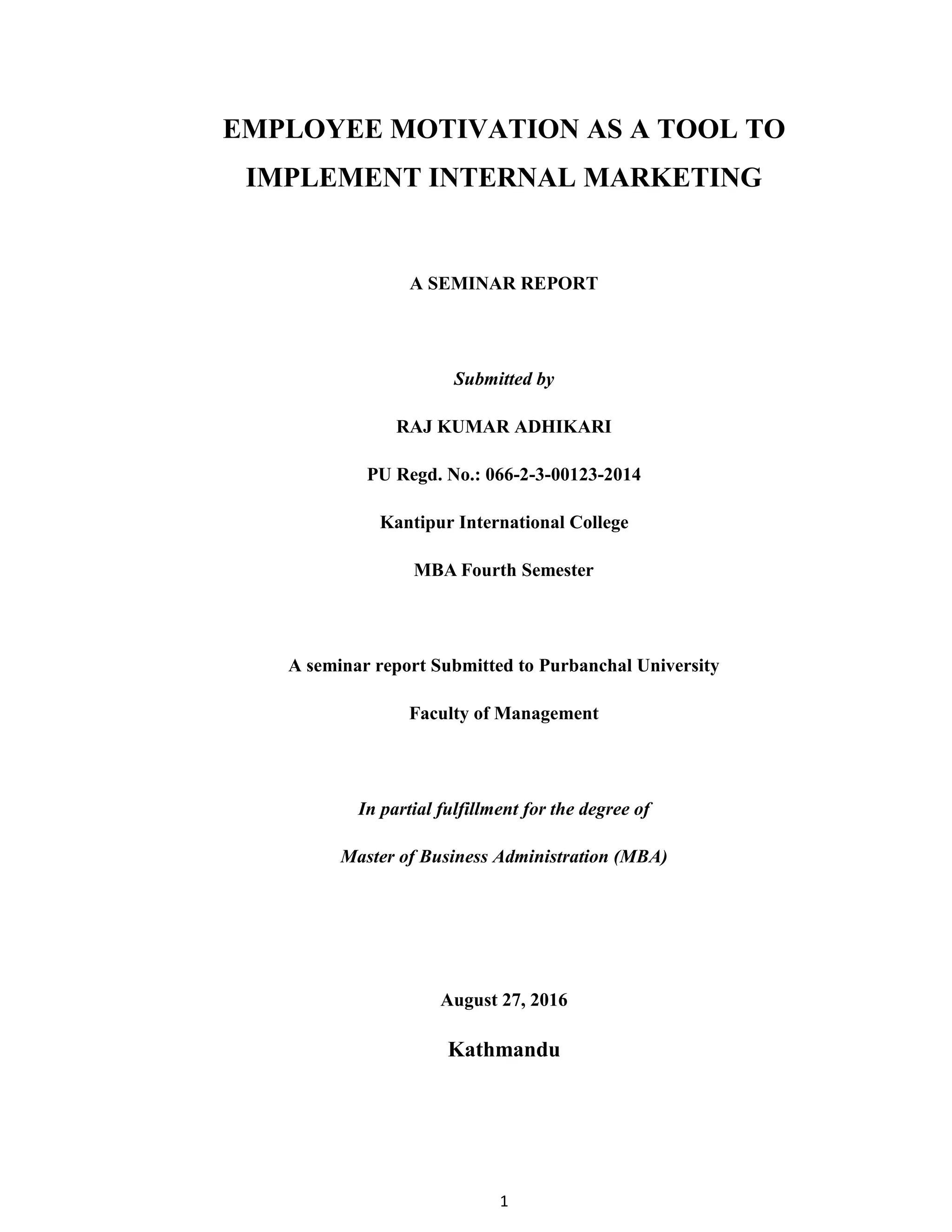 This seminar report by Raj Kumar Adhikari explores the crucial role of employee motivation in implementing internal marketing strategies to enhance service quality in organizations. It highlights that motivated employees are necessary for successful internal marketing and thus customer satisfaction, emphasizing the need for organizations to focus on motivating their workforce. The study aims to analyze the connection between employee motivation and internal marketing using Siddhartha Group as a case study, while also acknowledging limitations such as time and resource constraints.