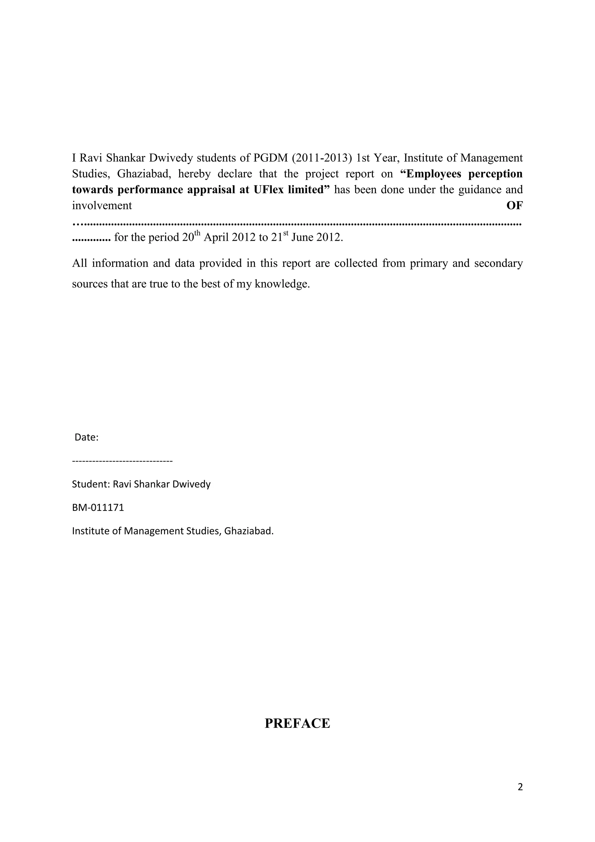 The document is a project report on employees' perceptions of performance appraisals at UFlex Limited. It includes an introduction to the company and HR department. The report aims to study employees' views of performance appraisals and how they can benefit organizations. Primary data was collected through surveys and from the HR department. The findings, conclusions, and recommendations are presented along with references. Performance appraisals are conducted annually to assess employees, provide feedback, and help improve performance and organizational goals.