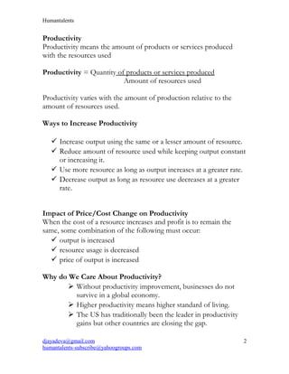 This document discusses employee productivity. It defines productivity and ways to increase it, including increasing output with the same resources, reducing resource use while maintaining output, and using more resources only if output increases more. It also discusses factors that affect productivity like job design, motivation, specialization of labor, and learning curves. World-class companies recognize the importance of empowering and training employees to problem solve and work in teams.