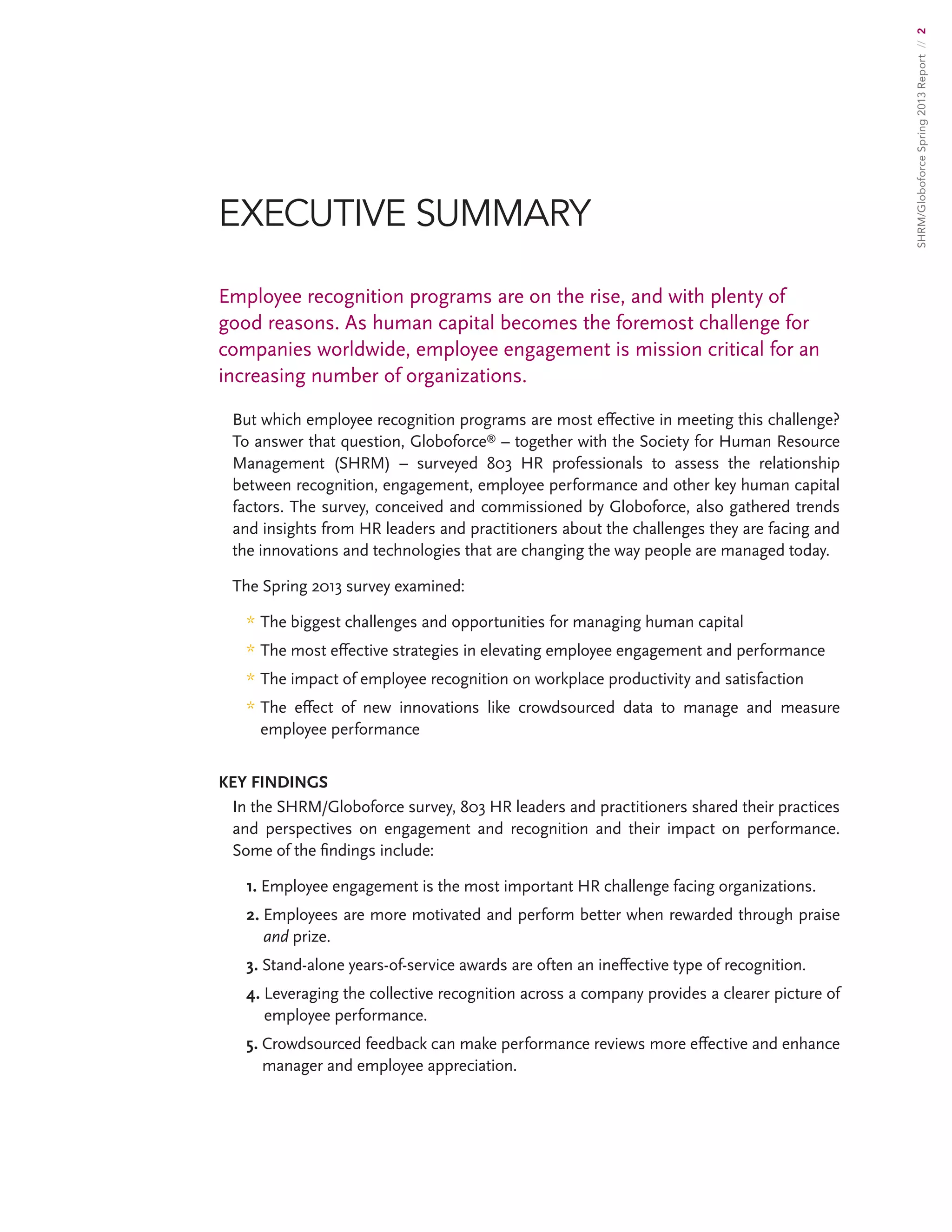 1. The survey found that employee engagement is the most important HR challenge facing organizations as human capital becomes critical to business success. Nearly half of respondents said engagement was a top challenge.