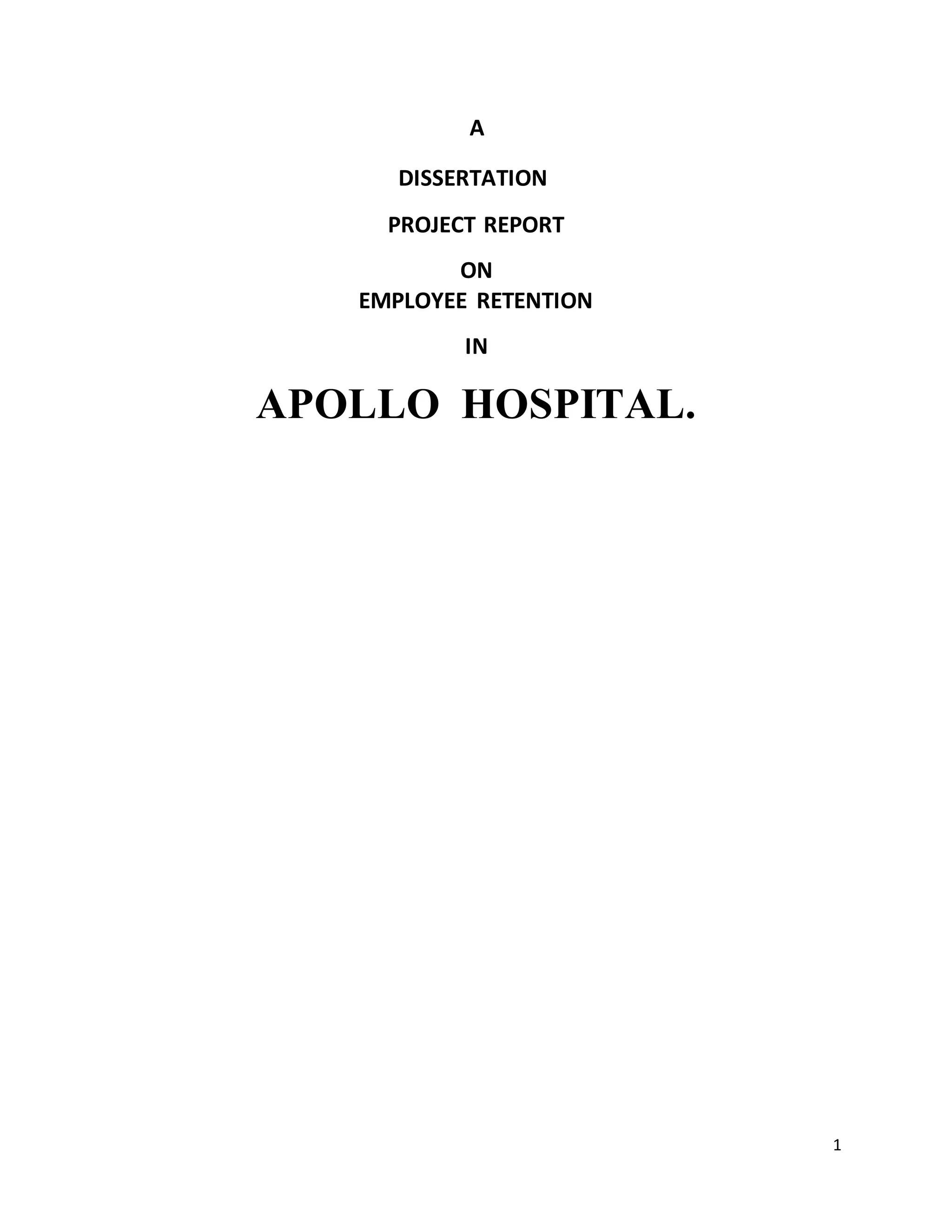 The document provides information on a dissertation project report on employee retention at Apollo Hospital. It discusses the purpose and importance of studying employee attrition. The objectives of the project are to analyze current retention rates, identify causes of attrition, and study measures to restructure the retention policy. The methodology includes a survey of 30 employees using a questionnaire to collect primary data on factors influencing job satisfaction and retention. Limitations of the study are a small sample size and potential issues with the questionnaire.