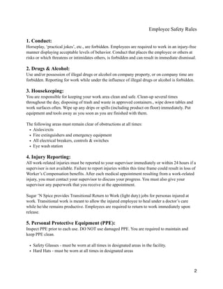The document is an employee safety guide from Sugar 'N Spice Inc. that outlines 16 safety rules and procedures for employees. It covers policies on conduct, drug and alcohol use, housekeeping, injury reporting, use of personal protective equipment, equipment operation, ladders, lifting devices, lockout/tagout, hazard communication, confined spaces, emergencies, vehicle use, electrical safety, lifting techniques, and accident reporting. The guide emphasizes the importance of safety, complying with rules to prevent injuries, and creating a safe work environment for all employees.