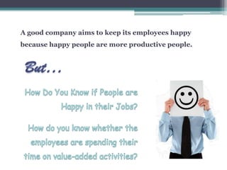 The case study explores employee satisfaction in a company and identifies that certain job categories have higher turnover rates. A survey was conducted to gather employee opinions on their tasks and time management, revealing that many employees spend time on low-value activities. The findings suggest the need for process improvements or automation of these activities to enhance productivity and employee satisfaction.