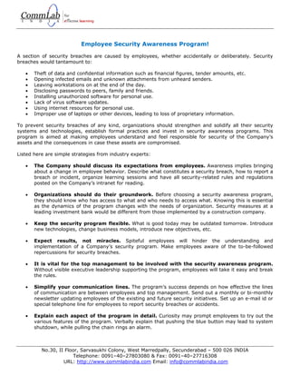 The document discusses the importance of employee security awareness programs. It notes that many security breaches are caused by employees, either intentionally or unintentionally. It recommends that companies strengthen security systems, establish formal security practices, and invest in security awareness programs to educate employees on security policies and their responsibilities. Such programs should involve clear communication of security expectations, flexibility to change over time, and metrics to measure the program's effectiveness at changing employee behavior.
