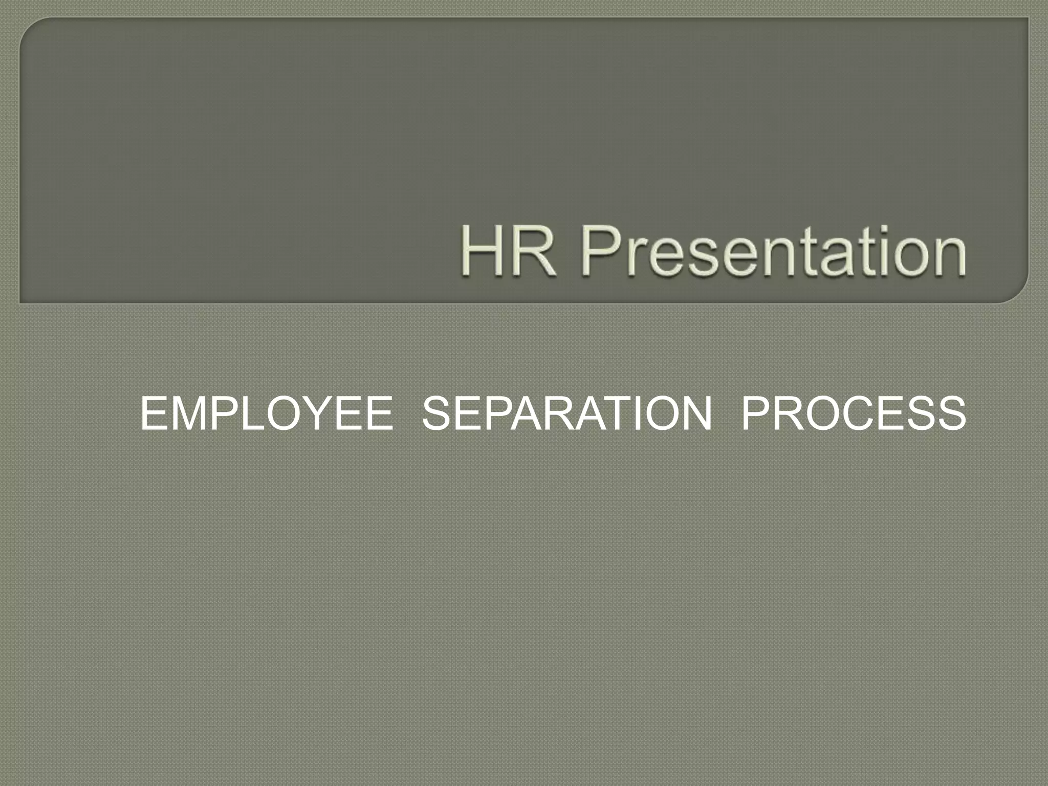 This document outlines the employee separation process for different types of separation including resignation, termination, retirement, discharge and dismissal. It provides steps for each process which involve obtaining necessary approvals, notifying the employee, calculating final payments and entitlements, settling any liabilities, and closing the employee file. The key steps common to most types of separation are determining final payments and entitlements based on policy, notifying the employee, settling any outstanding liabilities, obtaining necessary approvals, and making final payments to close the employee file.