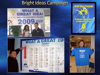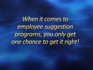 The document discusses the importance of employee engagement and suggestion systems in driving organizational productivity and innovation. It highlights that a significant percentage of employees do not feel supported by management or believe suggestion programs are ineffective, urging companies to implement targeted idea-gathering campaigns for improvement. Successful case studies are cited, showcasing the potential for substantial cost savings and performance enhancements through effective employee involvement.