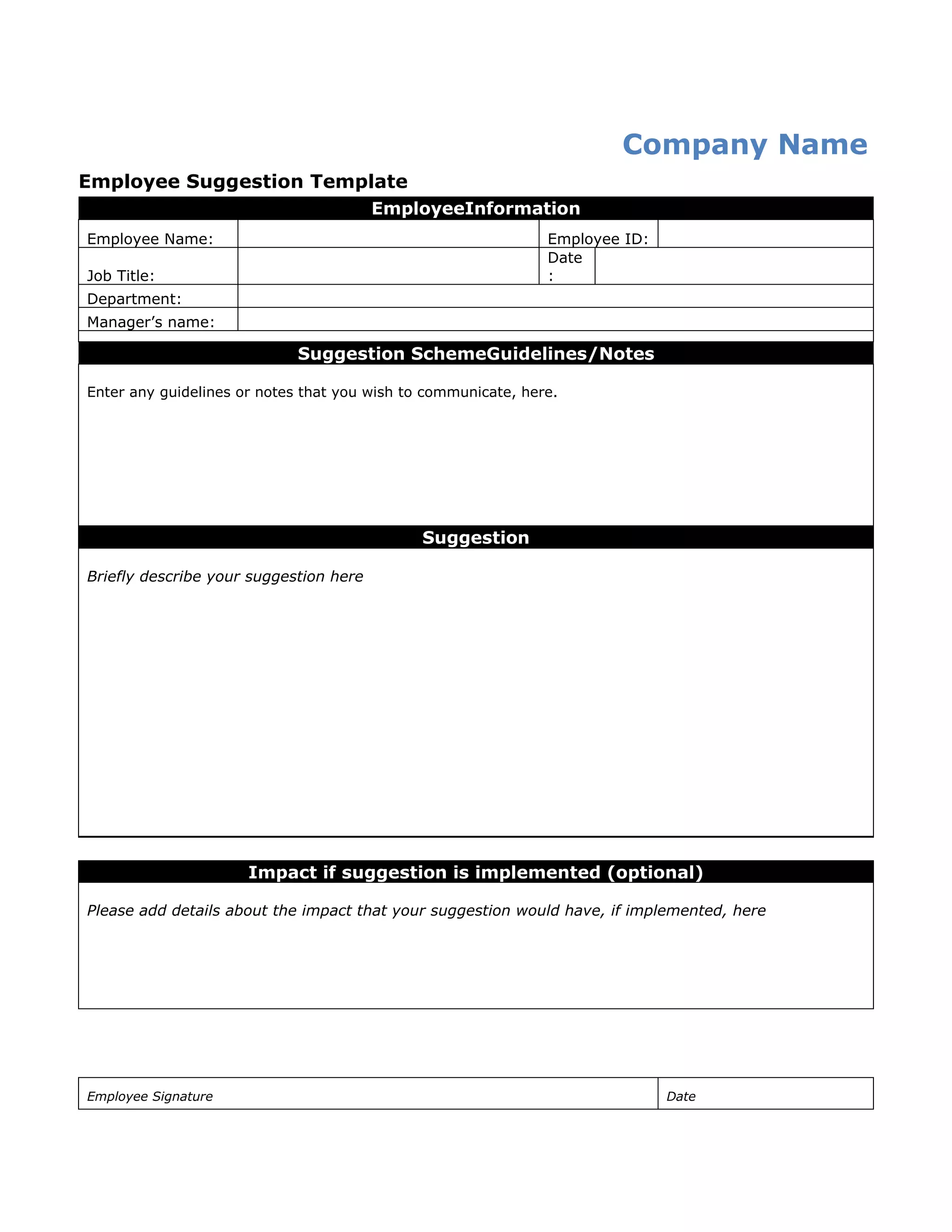 An employee suggestion template collects an employee's name, ID, job title, department, and manager along with details of their suggestion. The template includes space for the employee to briefly describe their suggestion and optionally note the impact of implementing it. The employee signs and dates the template before submitting it under the company's suggestion scheme guidelines.