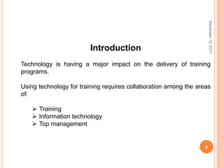This document discusses technology-based training methods. It begins by introducing how technology is impacting training delivery and requires collaboration between training, IT, and top management. It then describes various technology-based training methods like web-based, CD/DVD-based, and computer-based training. It outlines how technologies influence learning by allowing employees to control their training and access knowledge experts. The document also discusses online learning, social media, blended learning, simulations, mobile learning, intelligent tutoring systems, and distance learning. It addresses developing effective online learning and potential features. In the end, it outlines limitations of technology-based training and recommendations to overcome them.