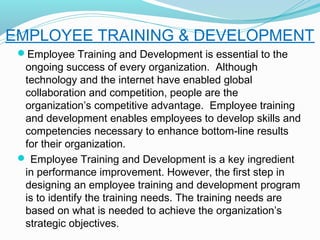 - Employee training and development is essential for organizational success as it enables employees to develop necessary skills. The first step is to identify training needs based on strategic objectives.