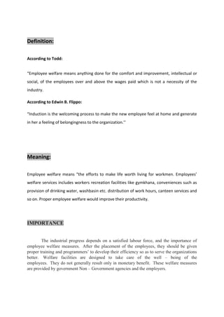 The document discusses the importance of employee welfare practices in enhancing employee motivation, satisfaction, and productivity within organizations. It outlines various welfare measures, their definitions, and their impact on improving the work environment and employee well-being. Furthermore, the document addresses statistical data of companies like Tata Consultancy Services and HDFC Bank, emphasizing their employee welfare initiatives and suggestions for improvement.