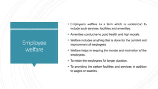 This document discusses employee welfare in organizations. It defines employee welfare as services, facilities, and amenities provided for employee comfort, health, and morale beyond wages and salaries. Employee welfare aims to retain employees, improve productivity and motivation, and provide relief from work fatigue. Statutory welfare schemes mandated by law include provisions for drinking water, first aid, sanitation, and insurance. Non-statutory schemes vary by organization but can include healthcare, transportation, housing assistance, education benefits, and loans. The document outlines some key Indian laws governing employee welfare and examples of common statutory and non-statutory schemes.