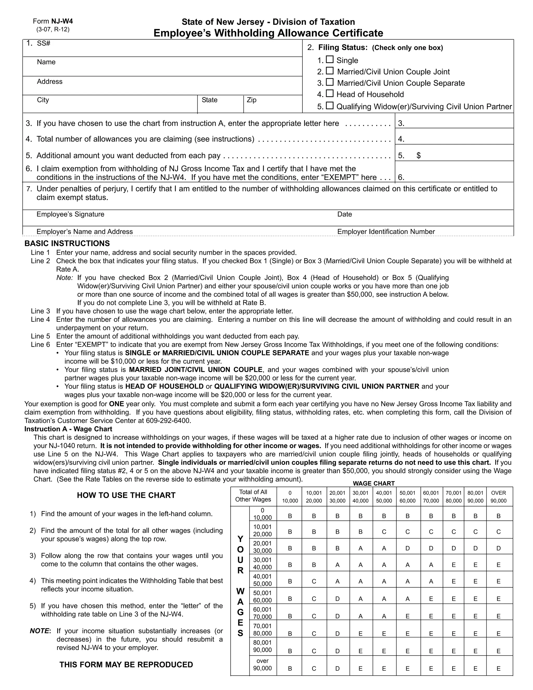 This document is a New Jersey Employee's Withholding Allowance Certificate (Form NJ-W4). It allows employees to claim withholding allowances to reduce the amount of state income tax withheld from their paychecks. The form collects information like the employee's name, address, filing status, and number of allowances claimed. It also contains instructions on how to properly fill out the form, including an optional wage chart to determine withholding amounts for higher-income employees.