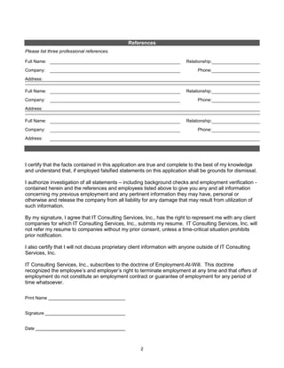 IT Consulting Services, Inc. provides an employment application for applicants seeking positions with the company. The application collects applicant information including name, address, contact details, availability, desired salary, and position applied for. It also asks if the applicant is open to relocation or requires sponsorship. The application requests a list of technical skills with years of experience and proficiency level. It asks for professional references and requires the applicant to certify the accuracy of the information and authorize background checks. By signing, the applicant agrees to terms regarding representation by the company and maintaining confidentiality of client information.