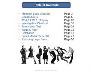 This document provides an employment law toolbox with various cheat sheets and guides on important employment law topics. It includes 3-sentence summaries of key employment laws such as the ADA, ADEA, EPA, ERISA, COBRA and FCRA. The toolbox is intended to serve as a quick reference for understanding essential elements of major employment statutes and avoiding common legal pitfalls.