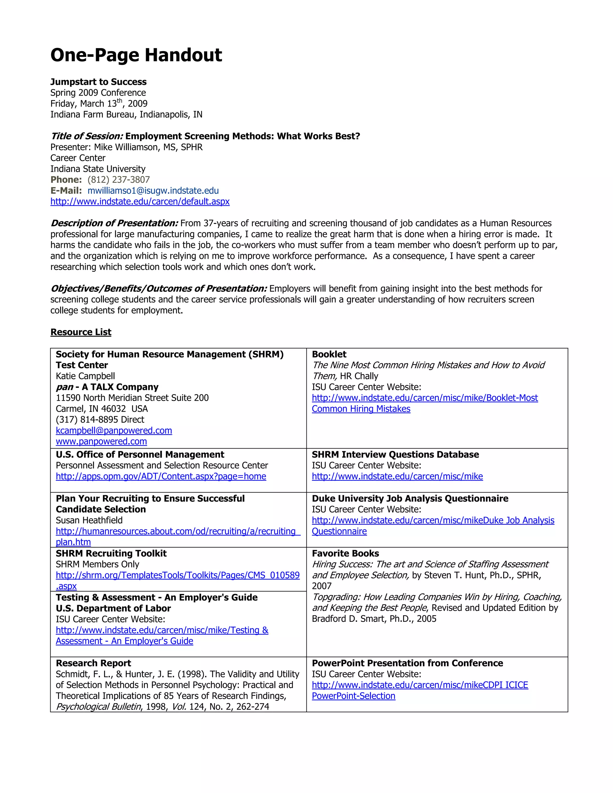 The document provides information about a presentation titled "Employment Screening Methods: What Works Best?" to be given by Mike Williamson at the Spring 2009 Conference in Indianapolis. The presentation will discuss the speaker's experience with different selection tools and screening methods based on his 37 years in human resources. Attendees will learn about best practices for screening college students and gain insight to help avoid common hiring mistakes.