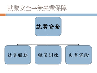 本文件探讨了我国的就业安全制度,包括失业保险、职业培训和就业服务等措施,旨在提升劳动力素质和保障失业者基本生活。文件涵盖了不同类型的职业培训以及针对特定人群(如年轻人和残障人士)的培训计划,强调了服务的整合性和多样化。为应对失业问题,政策包括扩大失业给付、加强就业媒合和推动雇主与企业间的合作。