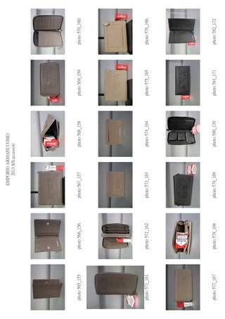 ACCESSORIES PREC-2013 DEADLINE 10/06/2012 A 39 40 41 42 43 44 45 46 SHOES D 44 46 48 50 52 54 56 58 60 BELT PHOTO MOD ART SAMPLE COL DESCRIPTION NOTE PRICE U ONE SIZE pcs. AMOUNT 506-507 YEMH05 YH187 80001 € 102.00 0 € - 508-509 YEMF09 YH187 80123 € 42.00 0 € - 510-511 YEM467 YH187 80123 € 54.00 0 € - 512-513 YEMH06 YH187 80001 € 90.00 0 € - 514-515 YEMH08 YH187 80123 € 60.00 0 € - 516-517 YEM122 YH187 80123 € 72.00 0 € - 518-519 YEM475 YH187 80035 € 78.00 0 € - 520-521 YEMF07 YH187 80035 € 60.00 0 € - 522-523 YEMH03 YH187 80001 € 138.00 0 € - 524-525 YEME47 YH187 80035 € 168.00 0 € - 526-527 YEME49 YH187 80123 € 96.00 0 € - 528-529 YEMH04 YH187 80035 € 84.00 0 € - 530 COLOR CARD 0 € - 531 YEMD29 YH185 80035 BAG € 177.00 0 € - 532 YEMH01 YH185 80001 BAG € 228.00 0 € - 533 YEME91 YH185 80001 BAG € 150.00 0 € - 534 YEMH09 YH185 80035 BAG € 126.00 0 € - 535 YEMH00 YH185 80010 BAG € 228.00 0 € - 536 YEME92 YH185 80035 BAG € 168.00 0 € - 537 YEMD26 YH185 80010 BAG € 246.00 0 € - 538 YEME93 YH185 80035 BAG € 288.00 0 € - 539 YEMD28 YH185 80010 BAG € 228.00 0 € - 540 YEMD30 YH185 80001 BAG € 192.00 0 € - 541 YEMD31 YH185 80010 BAG € 177.00 0 € - 542 COLOR CARD 0 € - 543-544 YEMF10 YH185 80001 WALLET € 84.00 0 € - 545-546 YEM475 YH185 80010 WALLET € 96.00 0 € - 547-458 YEMH05 YH185 80001 WALLET € 114.00 0 € - 549-550 YEM122 YH185 80010 WALLET € 84.00 0 € - 551-552 YEMH06 YH185 80035 WALLET € 102.00 0 € - 553-554 YEMH07 YH185 80035 WALLET € 78.00 0 € - 555-556 YEMD45 YH185 80035 WALLET € 102.00 0 € - 557-558 YEMH04 YH185 80035 WALLET € 90.00 0 € - 559-560 YEM390 YH185 80035 WALLET € 57.00 0 € - 561-562 YEMH08 YH185 80035 WALLET € 66.00 0 € - 563-564 YEMF08 YH185 80035 WALLET € 72.00 0 € - 565-566 YEM467 YH185 80025 WALLET € 60.00 0 € - 567-568 YEMF15 YH185 80025 WALLET € 72.00 0 € - 569-570 YEM867 YH185 80035 WALLET € 126.00 0 € - 571-572 YEME47 YH185 80035 WALLET € 174.00 0 € - 573-574 YEMF09 YH185 80010 WALLET € 48.00 0 € - 575-576 YEMF14 YH185 80010 WALLET € 66.00 0 € - 577-578 YEME49 YH185 80010 WALLET € 126.00 0 € - 579-780 YEMH03 YH185 80001 WALLET € 162.00 0 € - 581-582 YEM474 YH185 80001 WALLET € 108.00 0 € - 583-584 YEMF16 YH185 80001 WALLET € 84.00 0 € - 585 COLOR CARD 0 € - 586 YEM819 YC043 80002 BAG € 177.00 0 € - 587 YWM823 YC043 80080 BAG € 210.00 0 € - 588-589 YEM820 YC043 80002 BAG € 210.00 0 € - 590-591 YEMF22 YC043 80013 BAG 0 € - 592 YEMD52 YC043 80002 BAG 0 € - 593 YEMF23 YC043 80002 BAG 0 € - 594 YEM461 YC043 80080 BAG 0 € - 595 YEMF24 YC043 80080 BAG € 141.00 0 € - 596 YEM253 YC043 80002 BAG € 123.00 0 € - 597-598 YEM49 YC043 80002 WALLET € 162.00 0 € - 599-600 YEM49 YC043 80001 WALLET € 162.00 0 € - 601-602 YEMF07 YC043 80002 WALLET € 96.00 0 € - 603-604 YEM122 YC043 80001 WALLET € 102.00 0 € - 605-606 YEM475 YC043 80002 WALLET € 138.00 0 € - 607-608 YEM168 YC043 80267 WALLET € 69.00 0 € - 609-610 YEM467 YC043 80002 WALLET € 84.00 0 € - 611-612 YEM320 YC043 80001 WALLET € 60.00 0 € - 613-614 YEM474 YC043 80002 WALLET € 117.00 0 € - 615-616 YEM390 YC043 80080 WALLET € 66.00 0 € - 617 COLOR CARD 0 € - 618 YEM992 YCD22 88322 BAG € 120.00 0 € - 619 YEMI35 YCD22 88690 BAG € 159.00 0 € -