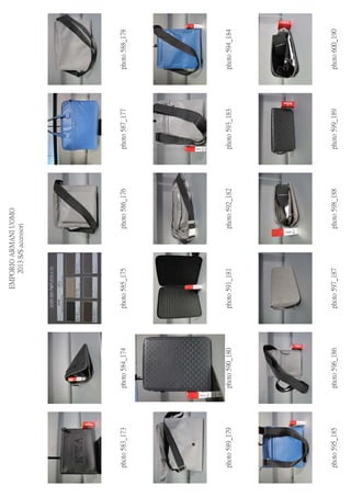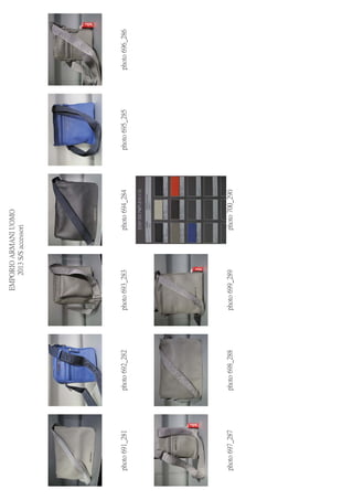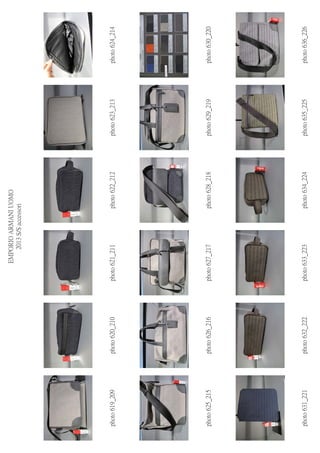 ACCESSORIES PREC-2013 DEADLINE 10/06/2012 A 39 40 41 42 43 44 45 46 SHOES D 44 46 48 50 52 54 56 58 60 BELT PHOTO MOD ART SAMPLE COL DESCRIPTION NOTE PRICE U ONE SIZE pcs. AMOUNT 411-412 YEMH24 YH384 85032 POST BAG CANVAS € 126.00 0 € - 413 YEMH21 YH384 88180 BAG CANVAS € 162.00 0 € - 414-415 YEMH22 YH384 87076 BAG CANVAS € 162.00 0 € - 416-417 YEMH13 YH384 88291 BAG CANVAS € 222.00 0 € - 418 COLOR CARD 0 € - 419-420 YEMH18 YH385 88001 NYLON BAG € 231.00 0 € - 421-422 YEMH16 YH385 88001 NYLON BAG 0 € - 423-424 YEMH15 YH385 88017 RUCK SAC € 297.00 0 € - 425-426 YEMH19 YH385 88017 NYLON BAG € 249.00 0 € - 427 COLOR CARD 0 € - 428 YEMI11 YH474 88305 LEATHER BAG € 252.00 0 € - 429 YEMI07 YH474 88305 LEATHER POST BAG € 444.00 0 € - 430-431 YEMI05 YH474 88001 LEATHER BAG € 318.00 0 € - 432-433 YEMF07 YC042 80002 LEATHER WALLET € 90.00 0 € - 434-435 YEM168 YC042 80080 LEATHER WALLET € 66.00 0 € - 436-437 YEM078 YC042 80001 LEATHER WALLET € 96.00 0 € - 438-439 YEM474 YC042 80002 LEATHER WALLET € 111.00 0 € - 440-441 YEM122 YC042 80001 LEATHER WALLET € 96.00 0 € - 442-443 YEM475 YC042 80001 LEATHER WALLET € 132.00 0 € - 444-445 YEME49 YC042 80001 LEATHER WALLET € 156.00 0 € - 446 COLOR CARD 0 € - 447-448 YEMI83 YH395 80002 PC BAG € 462.00 0 € - 449 YEMI47 YH395 86180 DOCUMENT BAG € 373.50 0 € - 450 YEMI46 YH395 86182 TRAVEL BAG € 498.00 0 € - 451 COLOR CARD 0 € - 452 YEMG55 YH480 88378 SMALL BAG € 198.00 0 € - 453 YEMI37 YH480 88378 BAG € 456.00 0 € - 454 YENF35 YH480 88378 BAG € 354.00 0 € - 455 YENF33 YH480 88378 BAG € 564.00 0 € - 456 COLOR CARD 0 € - 457 YEMF32 YH484 88825 BAG € 474.00 0 € - 458-459 YEMI37 YH484 88825 ROLL BAG € 354.00 0 € - 460-461 YEMF35 YH484 88825 BAG € 294.00 0 € - 462 COLOR CARD 0 € - 463 YEMI20 YH475 80458 € 288.00 0 € - 464 YEMI16 YH475 80001 € 348.00 0 € - 465 YEMI19 YH475 80028 € 348.00 0 € - 466 COLOR CARD 0 € - 467 YEMI10 YH475 80001 BAG € 396.00 0 € - 468 YEMI22 YH475 86047 BAG € 246.00 0 € - 469 COLOR CARD 0 € - 470 YEMI40 YH501 80009 € 456.00 0 € - 471 COLOR CARD 0 € - 472 YEMI38 YH414 80001 BAG € 306.00 0 € - 473 YEMI40 YH414 80010 BAG € 432.00 0 € - 474 COLOR CARD 0 € - 475 YEME95 YH187 80035 € 132.00 0 € - 476 YEME94 YH187 80123 € 138.00 0 € - 477 YEME96 YH187 80001 € 156.00 0 € - 478 YEMF03 YH187 80468 € 177.00 0 € - 479 YEMH07 YH187 80468 € 168.00 0 € - 480 YEME98 YH187 80123 € 117.00 0 € - 481 YEME97 YH187 80123 € 150.00 0 € - 482 YEMF04 YH187 80123 € 162.00 0 € - 483 YEMF83 YH187 80001 € 42.00 0 € - 484 YEMH09 YH187 80123 € 90.00 0 € - 485 YEMF13 YH187 80035 € 84.00 0 € - 486 YEMF12 YH187 80035 € 72.00 0 € - 487 YEMF05 YH187 80123 € 288.00 0 € - 488 YEMF01 YH187 80001 € 238.50 0 € - 489 COLOR CARD 0 € - 490-491 YEM176 YH187 80468 € 72.00 0 € - 492-493 YEM474 YH187 80001 € 78.00 0 € - 494-495 YEMF10 YH187 80035 € 72.00 0 € - 496-497 YEMF06 YH187 80123 € 48.00 0 € - 498-499 YEMF08 YH187 80035 € 57.00 0 € - 500-501 YEM867 YH187 80035 € 108.00 0 € - 502-503 YEM390 YH187 80123 € 48.00 0 € - 504-505 YEMD45 YH187 80468 € 84.00 0 € -