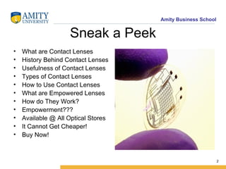 The document discusses contact lenses, their history, types, and practical advantages over glasses. It introduces 'empowered lenses,' which are technologically enhanced lenses allowing users to access information and knowledge seamlessly. Available in Delhi and NCR at a competitive price, these lenses come with promotional discounts and a free trial offer.