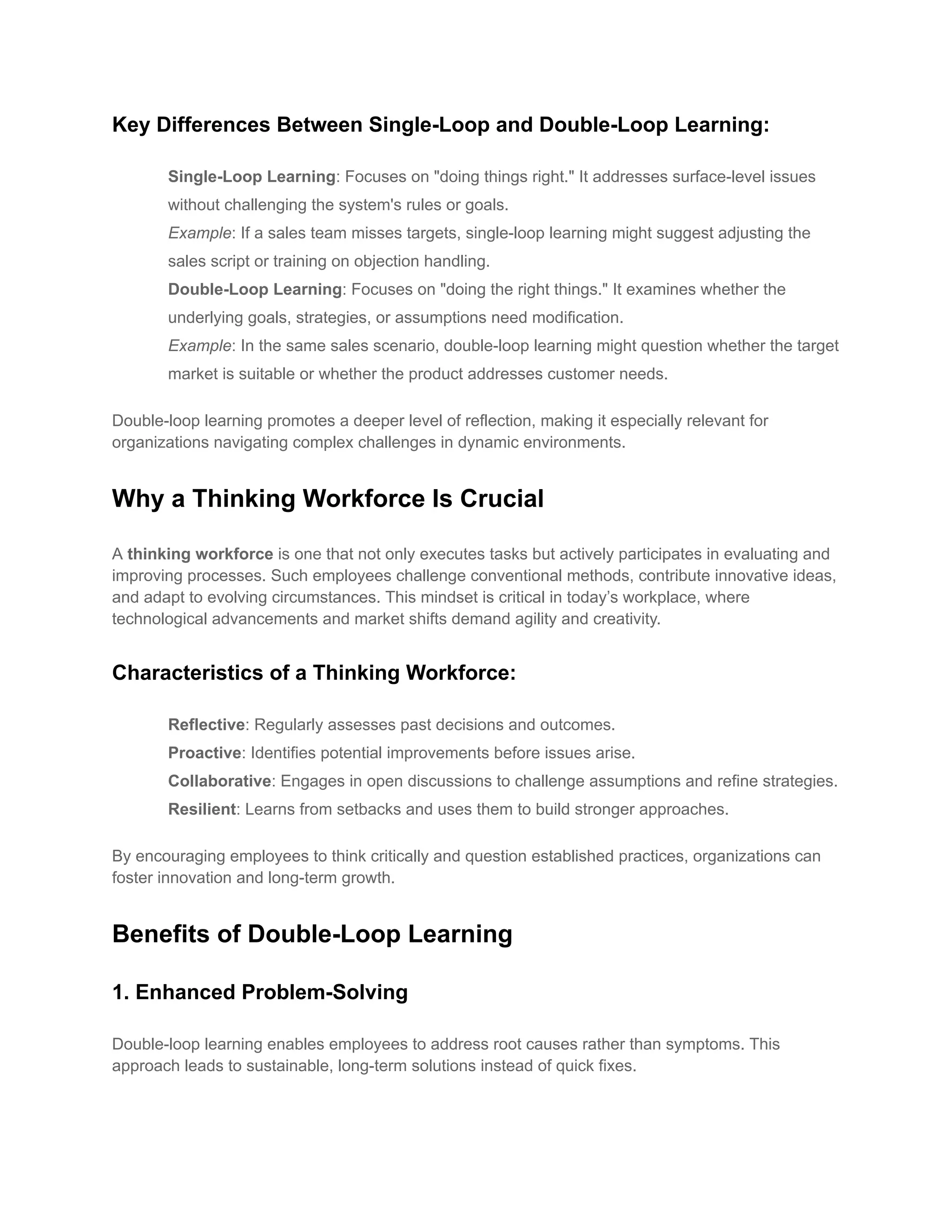 The document discusses double-loop learning, a methodology that encourages examining and questioning underlying assumptions and systems instead of merely fixing immediate errors. This approach fosters a thinking workforce characterized by critical thinking, adaptability, and innovation, which is essential for navigating complex business challenges. Additionally, it outlines practical strategies for integrating double-loop learning into corporate training programs to enhance problem-solving, decision-making, and organizational resilience.
