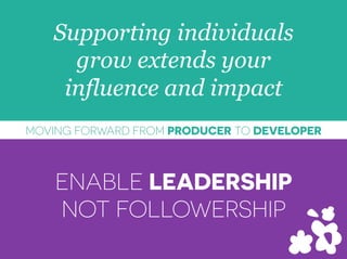 The document discusses empowering others through leadership development. It emphasizes that leaders should recruit talented people with leadership potential, model good leadership behaviors, and help develop others by assessing their strengths and weaknesses, challenging them to improve, and supporting their growth. Empowering others in this way enables sustainable organizational growth, assures the leader's larger impact, and provides fulfillment. Some potential downsides like ego, insecurity, and shortsightedness are also addressed. The document provides questions and strategies for effectively empowering and developing others as leaders.