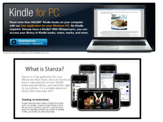 The document discusses the evolution of e-readers and e-books, highlighting their impact on libraries and the challenges posed by various digital formats and DRM schemes. It emphasizes the importance of adapting library services to incorporate digital resources while ensuring accessibility and minimizing frustrations caused by technology. The potential benefits of e-textbooks and the need for proactive strategies in engaging with new digital models in libraries are also covered.