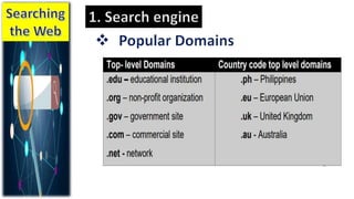 This document discusses how to search websites and databases. It defines URLs as addresses that refer to objects on the world wide web. It also outlines different Boolean operators - "or", "and", and "not" - that can be used to search terms and retrieve pages that do or do not include certain search terms. Knowing the URL endings and how to use Boolean operators allows users to better search for and evaluate online information sources.