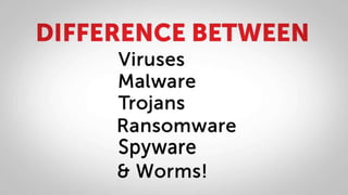 This document discusses various internet threats such as malware, spam, and phishing. It defines different types of malware like viruses, worms, trojans, spyware and adware. Viruses and worms are malicious programs that replicate and spread from one computer to another. Trojans pose as useful programs but leave computers unprotected. Spyware and keyloggers monitor users' activities without their knowledge. Spam refers to unwanted emails, while phishing tricks users into sharing private information on fake websites. It also provides tips to avoid copyright infringement and conduct safe online research.
