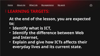 The document presents an overview of information and communication technology (ICT), defining key terms and concepts while highlighting its impact on daily life. It differentiates between the internet and the World Wide Web, explores the evolution of web versions, and examines emerging trends such as social media and mobile technologies. Additionally, it provides insights into hardware and software categories, empowering users with knowledge about the current state of ICT.