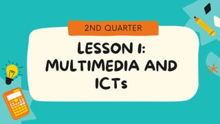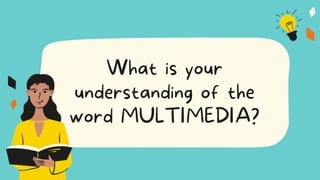 This document defines multimedia and its main elements. Multimedia is defined as a combination of text, graphics, video and sound delivered electronically. The five main elements are text, images, video, audio, and animation. Linear multimedia presents information without user navigation, while non-linear multimedia allows user interactivity. Multimedia content found online includes videos, games, tests, courses, podcasts and vodcasts. The uses of multimedia discussed are edutainment, business communication, entertainment, public information access, and virtual reality.