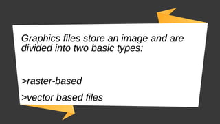 This document discusses different formats for images, text, and multimedia files. It explains that image files are either raster-based, made up of pixels that cannot be scaled without distortion, or vector-based, storing images as mathematical formulas that can be scaled. Common raster formats include JPEG, JPEG 2000 and TIFF, while common vector formats are DXF, EPS, CGM and shapefiles. Text files are often created in word processors and can be in proprietary, RTF, or PDF formats. Video and audio files contain moving images and sound, stored in proprietary formats like QuickTime, Windows Media, MPEG, AVI and WAV.