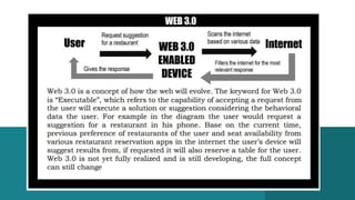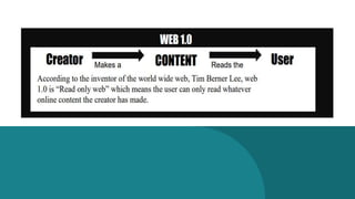 This document provides an introduction to information communication technology (ICT). It defines ICT as communication hardware or software that allows access, storage, transmission, and manipulation of information. The document discusses key aspects of ICT including its current state, the differences between the internet and world wide web, versions of the web including Web 1.0, 2.0, and 3.0, trends in ICT like social media and mobile technologies, and applications of ICT across different fields. The goal is to help readers understand the concept of ICT, how it has evolved, and how it is used in various industries.