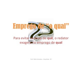 O documento discute o uso correto da expressão "o qual" no português. Ele explica que "o qual" deve ser usado (1) quando o relativo estiver distante do antecedente ou permitir mais de uma interpretação, e (2) depois de preposições com duas ou mais sílabas. Também recomenda usar "que" com preposições curtas como "a", "com", "de", "em" e "por", e depois de indefinidos, numerais e superlativos.