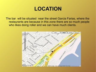 The document proposes opening a roller skating bar near Garcia Farias street in Barcelona. The bar would have a skating area for lessons, competitions, and open skate sessions. It would also serve food and drinks. The document outlines the location, social objectives, design, proposed activities, pricing, financing plan, market research, operating hours, and contact information for the proposed bar.