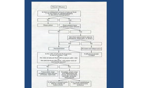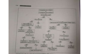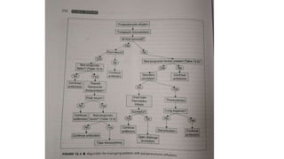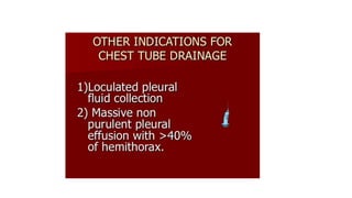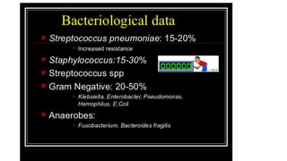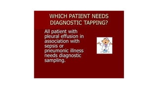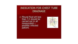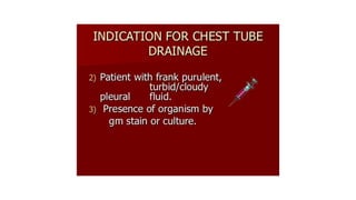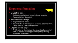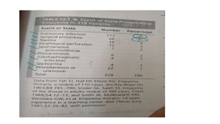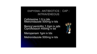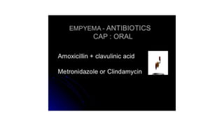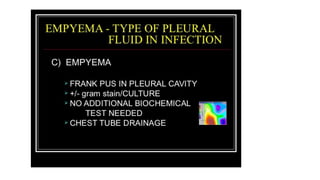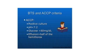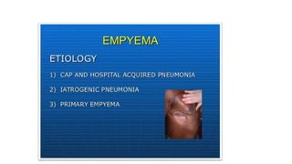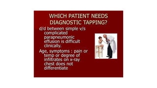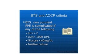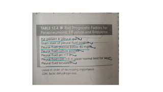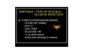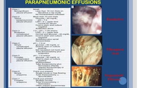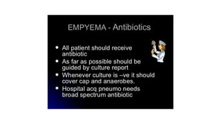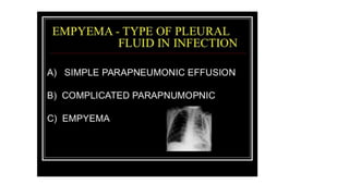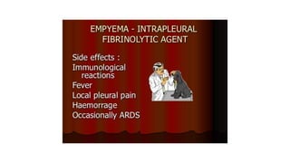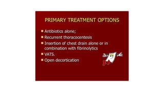 This document discusses parapneumonic effusion and empyema. It defines a parapneumonic effusion as any pleural effusion associated with bacterial pneumonia, lung abscess, or bronchiectasis. Empyema is specifically defined as pus in the pleural space. It then outlines various treatment options for pleural fluid including observation, therapeutic thoracentesis, tube thoracostomy, intrapleural fibrinolytics, VATS with lysis of adhesions and/or decortication, decortication, and open drainage. It provides details on studies investigating the effectiveness of intrapleural fibrinolytics.