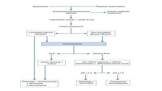 Bacterial pneumonia can result in parapneumonic effusions or empyema in the pleural space in about 40% of hospitalized cases. Empyema is defined as pus in the pleural space. Effusions are classified into exudative, fibropurulent, and organized stages. Common bacteria include Staphylococcus aureus, Streptococcus pneumoniae, and various gram-negative rods. Diagnosis involves chest imaging, microbiology of pleural fluid, and biochemistry of the fluid. Treatment involves antibiotics, tube thoracostomy, possible intrapleural fibrinolytics or antibiotics, and potentially more invasive procedures like thoracoscopy or thoracotomy if the effusion becomes complicated or organized