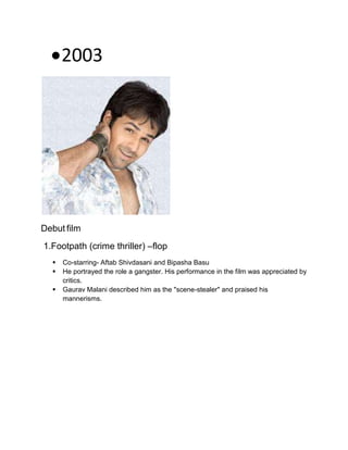 Emraan Hashmi is an Indian film actor known for Hindi language films. He began his career as an assistant director before making his debut in 2003. Though initially criticized for repetitive roles, he became known as a "serial kisser" and "Hit Machine". Some of his critically acclaimed roles include Murder (2004), Gangster (2006), Jannat (2008), and Once Upon a Time in Mumbaai (2010). He has continued taking on diverse roles in films spanning various genres.