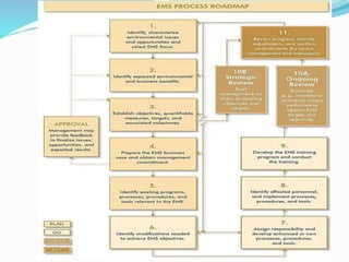 ISO 14001 is an international standard for environmental management systems. It provides a framework for organizations to manage their environmental responsibilities, comply with regulations, and improve their environmental performance. The standard can be applied to any organization seeking to manage its environmental impact. It involves commitments from senior management, assessing environmental impacts, setting objectives, implementing programs, monitoring results, and reviewing processes. Some benefits of ISO 14001 certification include improved efficiency, compliance with regulations, and strengthened supplier and customer relationships.