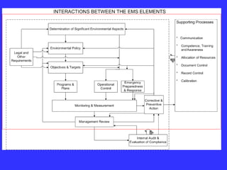 The document outlines the implementation of an Environmental Management System (EMS) in accordance with ISO 14001:2004 standards, detailing its significance, planning, and execution stages. It emphasizes the role of management, the importance of continuous improvement, and the resources required for successful EMS establishment, alongside barriers that may hinder its effectiveness. Ultimately, a well-implemented EMS is presented as a means to enhance environmental performance, achieve regulatory compliance, and foster a positive organizational culture.