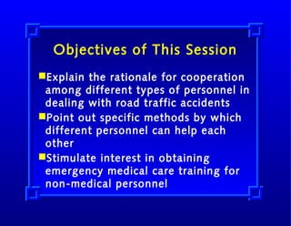 This document discusses the importance of cooperation among different emergency services including police, firefighters, rescue, and medical personnel in responding to traffic accidents. It emphasizes having pre-determined protocols for coordination, such as who is in charge at the scene. Regular drills and review sessions can help improve interactions between services. Cross-training personnel in some duties of other services may also aid coordination efforts and lead to the best outcomes for patients.