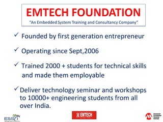 The document describes a consultancy company founded by a first-generation entrepreneur in September 2006, specializing in providing career training to engineers. It has successfully trained over 2,000 students and delivered seminars to more than 10,000 engineering students across India, emphasizing customer satisfaction and ethical business practices. The company is recognized as a trusted provider in the embedded systems training field.
