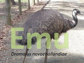 The emu is Australia's largest native bird. It is flightless and lives in mainland Australia, except cities, dense forests and dry areas. Emus are between 150-190cm tall, weigh 18-48kg, and males and females are similar in size. The male emu incubates the eggs and cares for the chicks after hatching. Emus eat grasses, seeds, insects and fruits, and were historically hunted by Aboriginals and settlers.