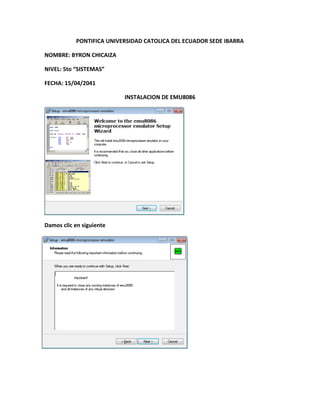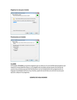 This document contains code examples in assembly language for the EMU8086 emulator. It includes examples for "Hola Mundo" (Hello World), displaying data, comparing numbers, and summing 10 numbers. The code displays text on the screen and performs basic operations like addition, comparison and printing values.