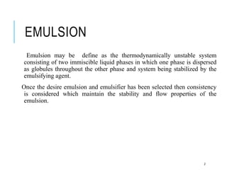 This document discusses pharmaceutical emulsions. It defines emulsion as an unstable system consisting of two immiscible liquids where one is dispersed as globules in the other. There are several types of emulsions including simple, multiple, micro, and nanoemulsions. The type of emulsion can be determined through tests like dilution, dye solubility, conductivity, cobalt chloride, and fluorescence. Emulsions have pharmaceutical applications for oral, parenteral, and topical products. They can increase drug solubility, bioavailability, and favor topical drug delivery. The key components of emulsions include oils, emulsifiers, preservatives, antioxidants, and viscosity modifiers.