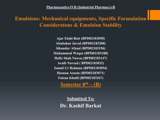 This document discusses emulsions, including their definition, types, formulation considerations, and stability factors. It defines emulsions as dispersions of one liquid in another immiscible liquid, stabilized by an emulsifying agent. The key types described are oil-in-water and water-in-oil emulsions. Important formulation considerations include phase ratio, droplet size, viscosity, density differences, and use of emulsifiers. Factors affecting stability include creaming, flocculation, coalescence, phase inversion, and Ostwald ripening. Methods to enhance stability include reducing particle size and density differences and increasing viscosity.