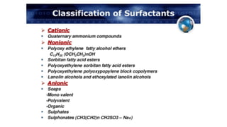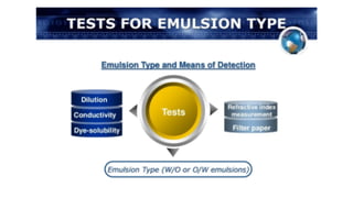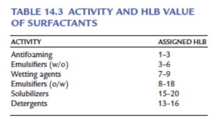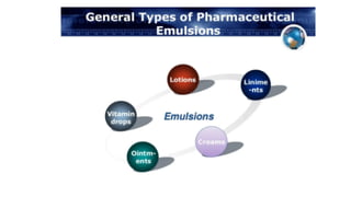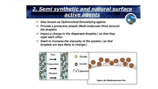 The document discusses biphasic systems, specifically emulsions, explaining their purpose and the theories behind emulsification such as surface tension theory, oriented-wedge theory, and inter-facial film theory. It outlines various methods for preparing emulsions, including the continental and English methods, while detailing the role of surfactants and their hydrophilic-lipophilic balance (HLB) in stabilizing emulsions. Additionally, it provides examples of oral and topical emulsions, emphasizing their formulations and packaging requirements.